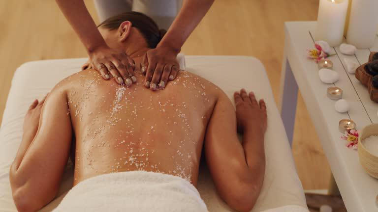 Full body scrub massage typically containing ingredients like salt, sugar, and coffee scrub is use to gently scrub away the dead skin cells that help reveal the fresh, healthy skin underneath leaving the skin feeling smooth and soft help with issues like dry skin, rough and patches and feel relax.